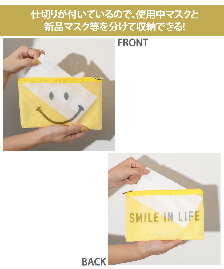 ▼メーカー希望小売価格はメーカーカタログに基づいて掲載しています ←クリックで拡大します●メッシュ素材のかわいいスマイルポーチ 仕切りが付いているので、使用中マスクと新品マスク等を分けて収納できます。